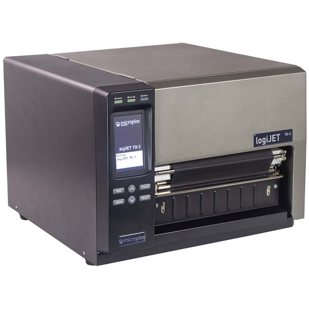 The Microplex logiJET T8-3 is an industrial wide-format thermal printer designed for high-volume label production and large-format applications.